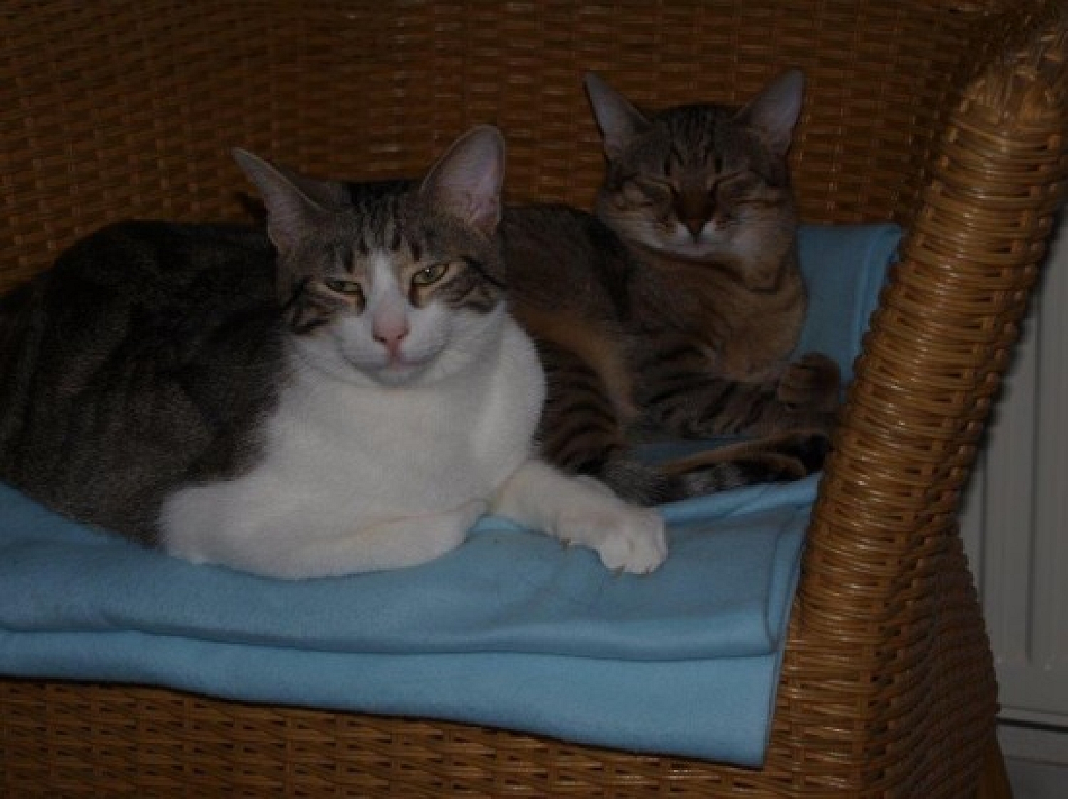 Einige Zeit ist jetzt vergangen und unsere beiden Racker haben sich das ganze Haus zu Eigen gemacht. Man könnte die Beiden mit einem jungen Paar vergleichen. Lia, die etwas feinere Dame, achtet sehr auf Sauberkeit. Wenn Merlin mal auf der Toilette war, prüft sie gleich, ob auch alles richtig verscharrt ist. Wichtig! Die beiden gehen nur zur Toilette, wenn sie vorher gereinigt und glatt gestrichen ist. Beim Essen ist Lia ebenfalls die Dame am Tisch. Merlin macht sich ab 17.00 Uhr schon bermerkbar und stürzt sich auch regelrecht auf die nasse Kost. Lia hingegen begutachtet erst einmal die Speise, um sich dann gesittet zu Tisch zu begeben. Merlin muß geführt werden. Oft vermißt er Lia und ist dann kaum noch zu trösten. Dabei möchte Lia auch mal ihre Ruhe vor ihm haben und versteckt sich dann im Obergeschoß. Beide sind zu unserer Freude sehr vital. Man verspürt täglich mehr ihren Drang nach Draußen. Fensterbänke müssen so gestaltet sein, daß sie katzengerecht begehbar sind. Morgens werden wir von Lia geweckt. Die morgendliche Gesichtswäsche meiner Frau übernimmt Lia. Merlin trottet ihr hinterher. Wir haben Spaß an den Beiden!