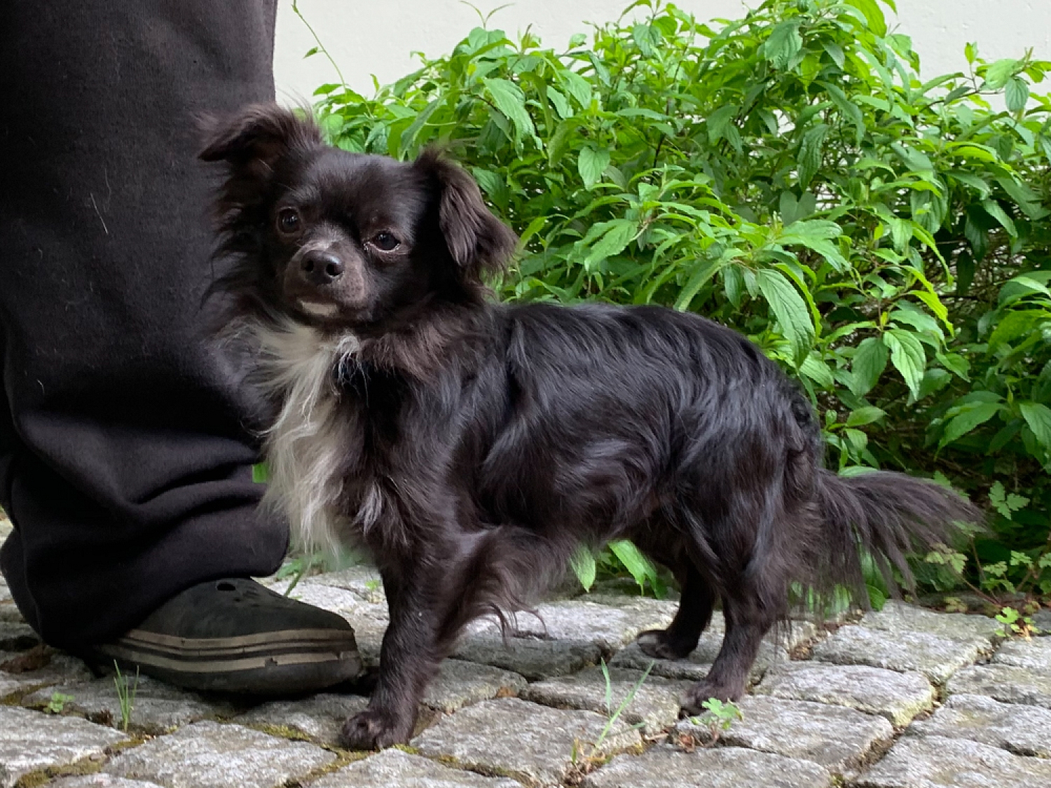 Bei ihm unbekanten Menschen ist er noch sehr unsicher und lässt sich nicht anfassen, interessiert sich aber zunehmend für Fremde.