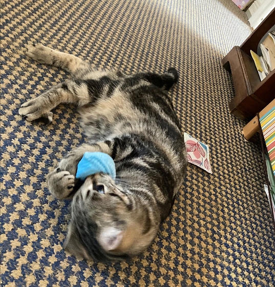 Update der Pflegefamilie Dezember 2025: Bindi will gerne spielen und gestreichelt werden und so wirft sie sich auf das Sofa oder den Boden und dreht sich auf den Rücken, so dass sie am Bauch gestreichelt und gekrault werden kann. Sie ist neugierig und naturverbunden, sie gräbt gerne in Blumentöpfen ; ))
