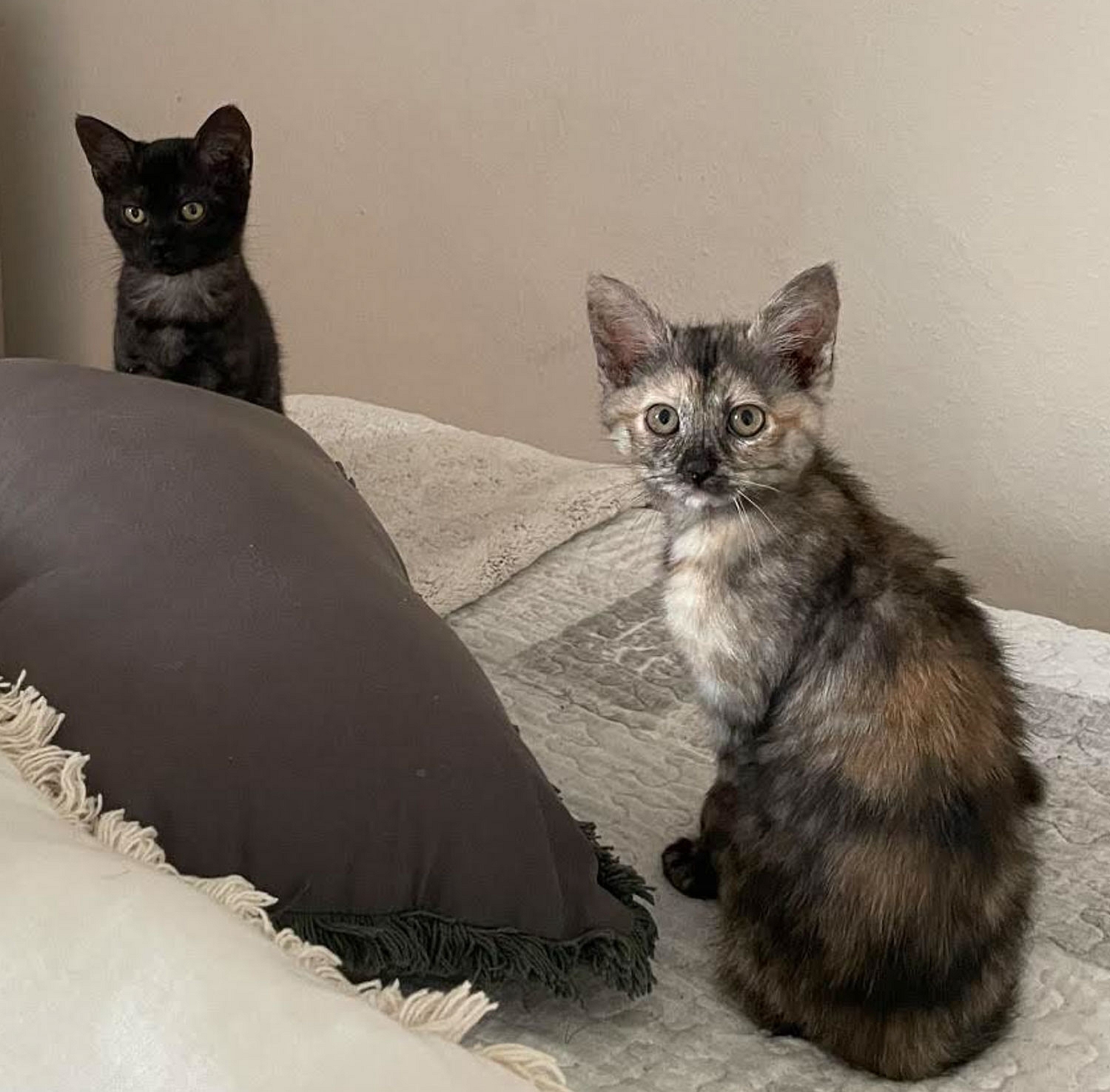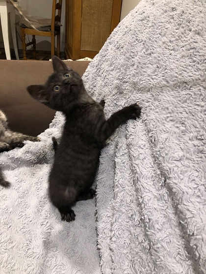 Inzwischen haben sich beide sehr gut entwickelt und haben die Hunde und anderen Katzen im Haushalt als Spielgefährten.