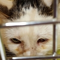 Eve war von Flöhen übersäht, stank fürchterlich nach Pipi und hatte neben starkem Untergewicht (nur ca. 1000g) auch ein entzündetes und geschwollenes Auge. Vermutlich hat sie Katzenschnupfen und ihre Augenentzündung rührt daher.