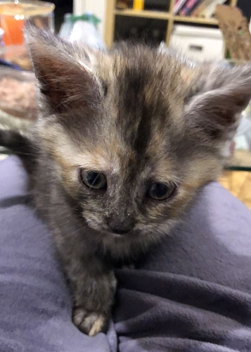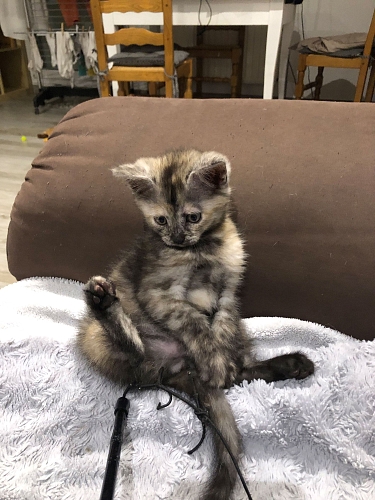 Derzeit spielt sie meist mit ihrer Schwester Dora. Die anderen Tiere im Haushalt sind drei erwachsene Katzen und drei Hunde. Sie kommt gut mit allen aus.