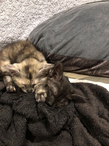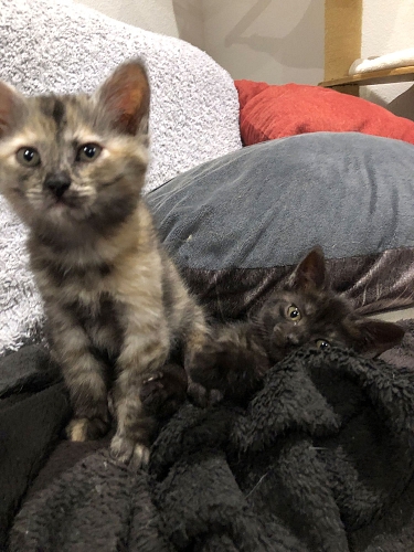 Inzwischen haben sich beide sehr gut entwickelt und haben die Hunde und anderen Katzen im Haushalt als Spielgefährten.